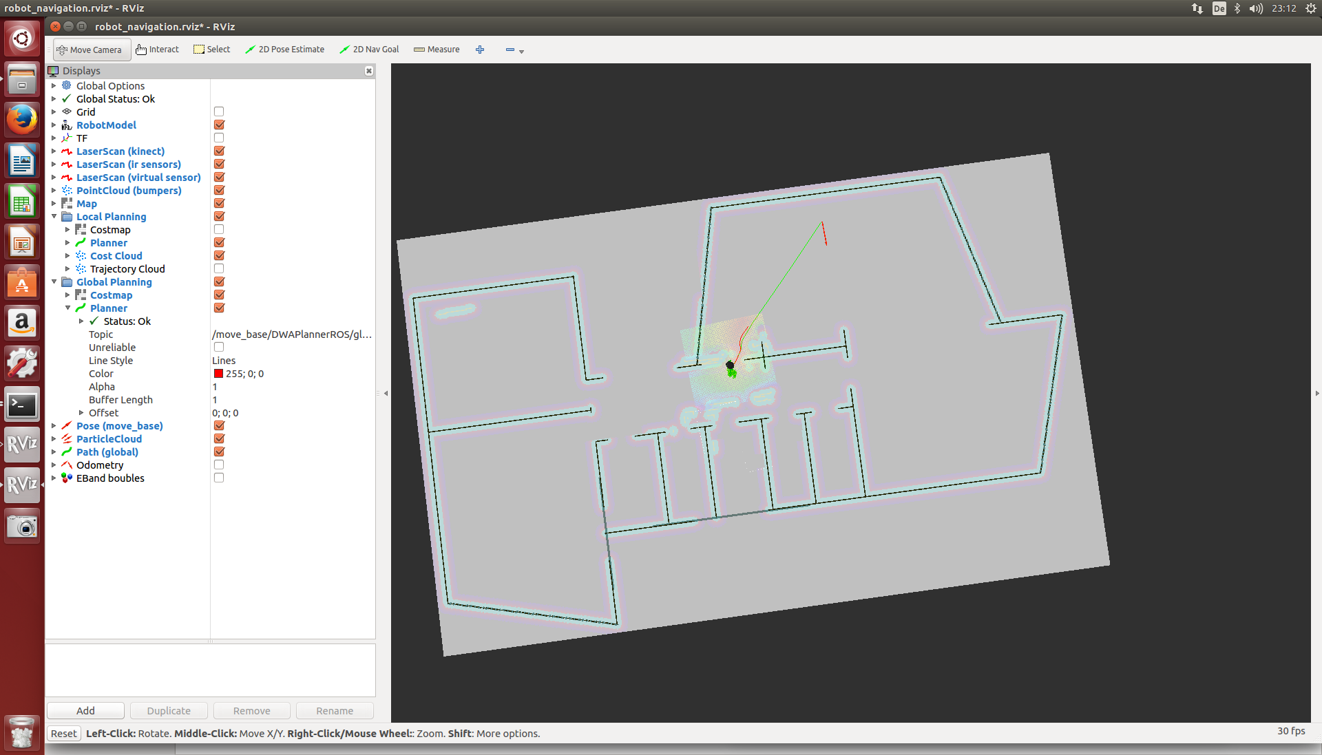 Auf dem obigen Screenshot wird die Anwendung RVIZ mit der initialisierten 2D-Karte des Zentrums gezeigt. Wie zu erkennen ist, navigiert der Roboter auf einem Pfad zu dem nächsten 2D-Navi-Goal. Die lokale Costmap, welche in den unterschiedlichen Farben zu sehen ist, sind die Daten von den verschiedenen Sensoren. In Gazebo bewegt sich zeitgleich der Roboter Richtung Navigationsziel. Würde man jetzt ein Objekt dem Roboter in den Weg legen, würde dieser den Pfad neu berechnen und an dem Hindernis vorbeifahren, wenn möglich. Wenn der Roboter keinen geeigneten Weg um das Objekt findet, würde dieser stehen bleiben und sich nach einigen Sekunden im Kreis drehen, um wieder mit der Berechnung eines neuen Weges zu starten.